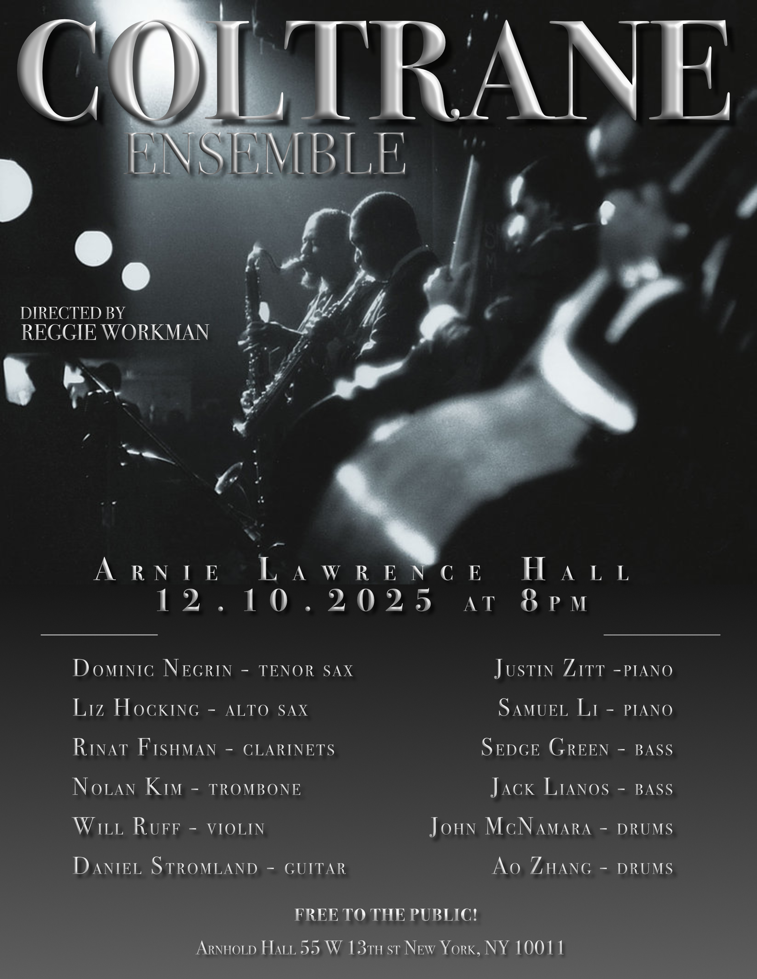 December 9th, 2019 - John Coltrane Student Ensemble at The New School under the direction of Reggie Workman, FREE - Arnhold Hall - 55 W 13th St, New York, NY 10011